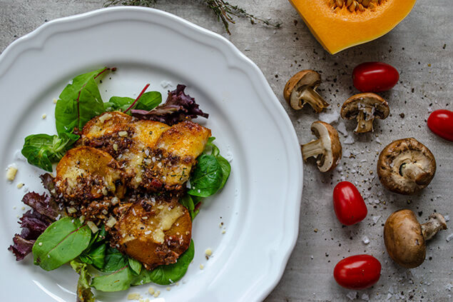 Skiva upp pumpan i 0.5 cm tjocka skivor, krydda med salt och svartpeppar. Stek sedan på medelvärme i omgångar med lite smör ungefär 1 minut på varje sida.