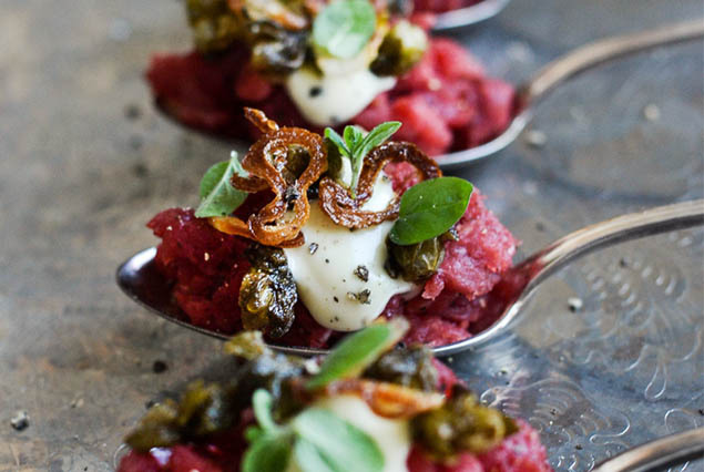 - Lägg råbiffen på skedar, toppa med dijonaise, friterad kapris och lök