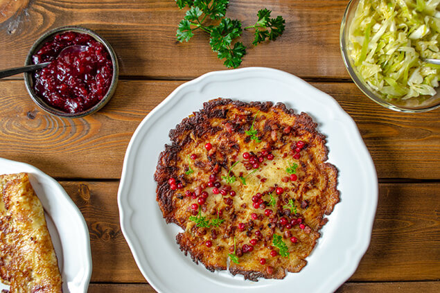 Stek ungefär 1 dl raggmunkssmet åt gången i rikligt med smör, gärna i samma panna som baconet när det är klart då det ger god smak. Lägg i en klick smör mellan varje raggmunk som du steker.