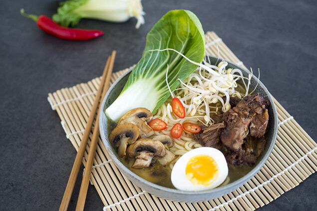 - Fördela nudlar, en ägghalva, pak choi, stekt svamp, böngroddar och fläskkarré i djupa portionsskålar. Häll sedan på buljong och ät direkt.