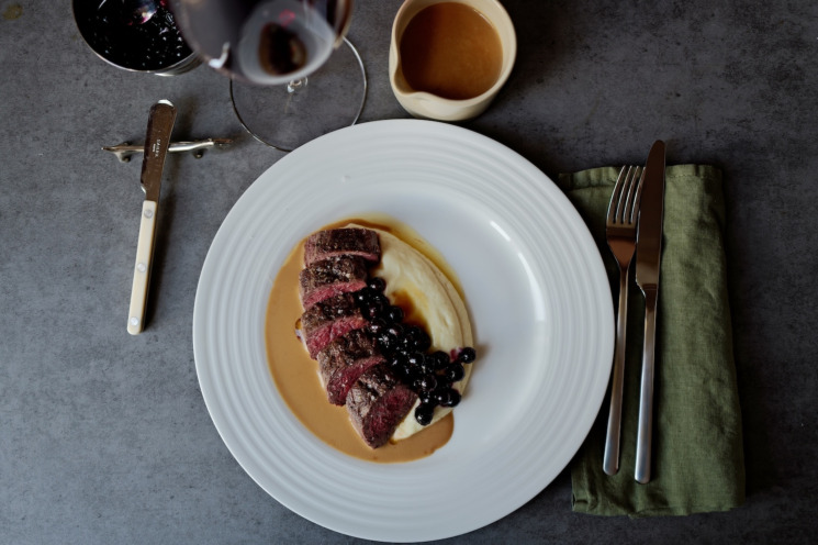 Renfilé med rotselleripuré, konjaksås och svartvinbär