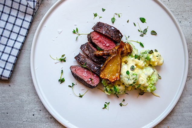 Värm upp en panna, tillsätt en skvätt olja och stek köttet på hög värme runt om hela detaljen. Sänk värmen på stekpannan och tillsätt smör, en klyfta vitlök och en kvist timjan. Ös köttet med smör tills du når en innertemperatur på 57 grader. Lägg på en skärbräda och låt vila 5-10 minuter innan du skivar upp och serverar. Spara gärna smöret i pannan och ös en sked över köttet när du ska servera.