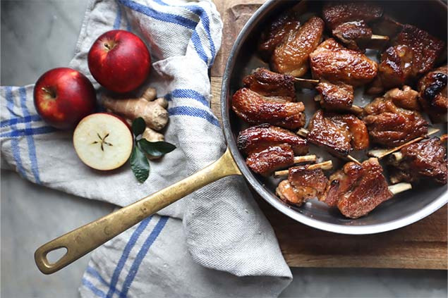 Revbensspjäll som blir fantastiskt möra efter varsam tillagning i gryta och sedan glaseras i ugnen med en sötsyrlig glaze på äppelmust, äppelmos, ingefära och lök. Saftiga och fulla av smak, perfekta till helgmiddagen eller julbordet.