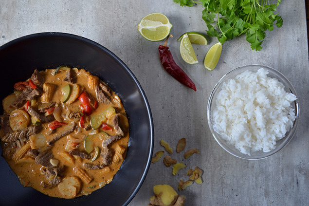 Smaka upp grytan med salt, röd curry och lime servera sedan tillsammans med ris.