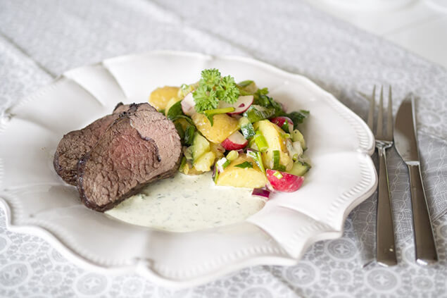 Rödvinsmarinerad rostas med potatissallad och örtsås