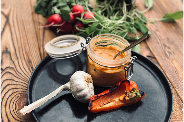 Dela paprikan, löken, vitlöken, chilin och lägg på en plåt. Ringla över olivolja, salt och rosta i ugnen på 250 grader tills de får en mörk färg.