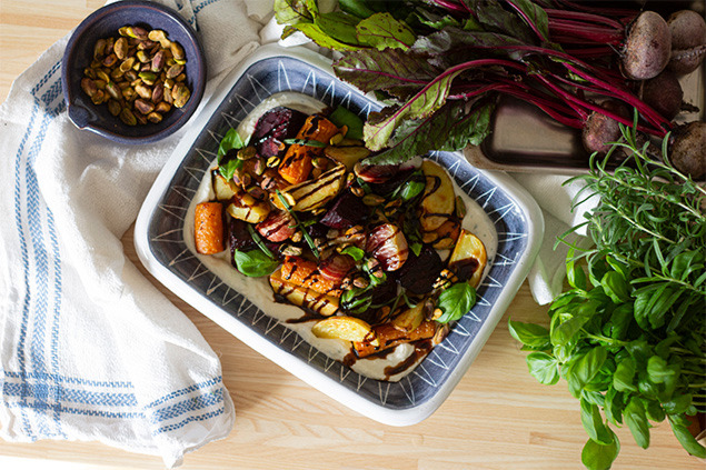 - Toppa med pistagenötter, balsamico, rosmarin och basilika.
