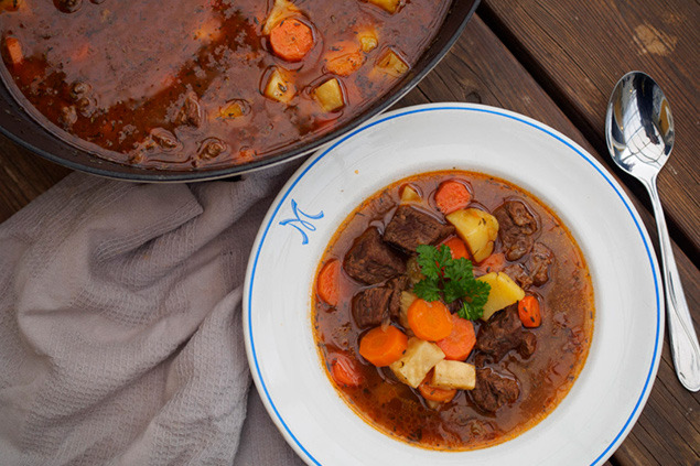 - Smaka så rotfrukterna är mjuka och köttet mört. Krydda med salt och svartpeppar och servera med persilja.