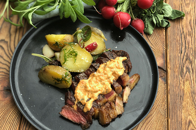 Blanda ihop sallad och rädisor med din potatis, häll över det brynta smöret och klipp i massa dill. Servera tillsammans med paprikasåsen och ditt nygrillade kött.