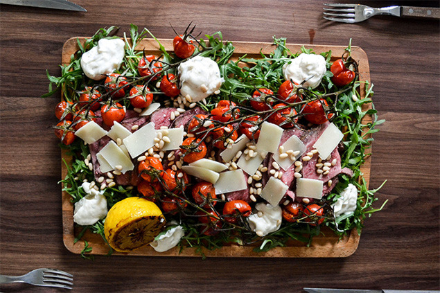 - Lägg på ruccola, kött, kvisttomater, hyvlad parmesan och klickar av såsen på en skärbräda.