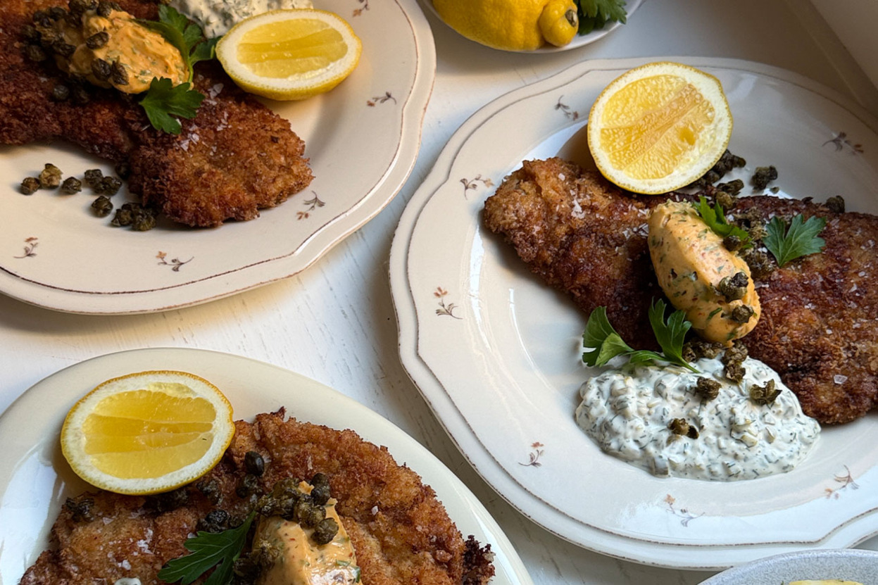 Klassisk schnitzel med krispig yta serverad med kryddsmör, tartarsås, friterad kapris och en fräsch potatissallad. En rätt som känns både rustik och lyxig på samma gång, perfekt till helgmiddagen eller när du vill bjuda på något extra gott med råvaror i fokus. Recept av Klara Ingemyr @1000smårätter.