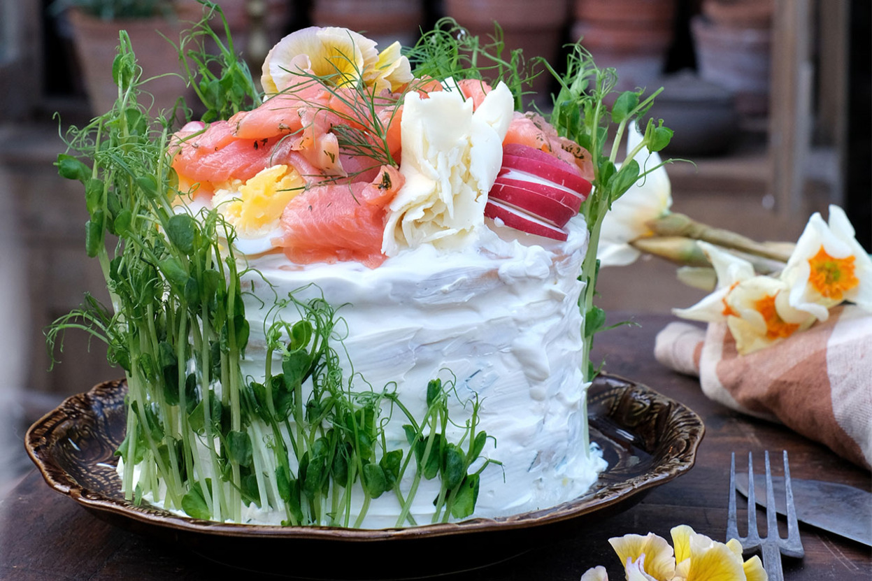 - Dekorera tårtan med dillgravad regnbågsfilé, kokta klyftade ägg och osten Vallrun, rädisor, dill och ärtskott.