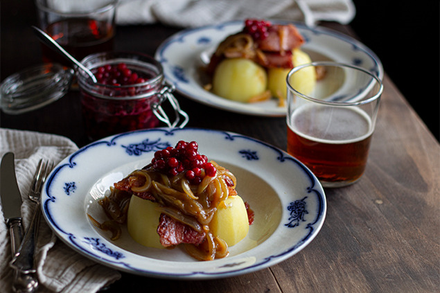 - Servera sidfläsket med kokt potatis, löksås och rårörda lingon.