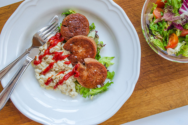 Skiva upp falukorven i önskad storlek och stek i en klick smör.