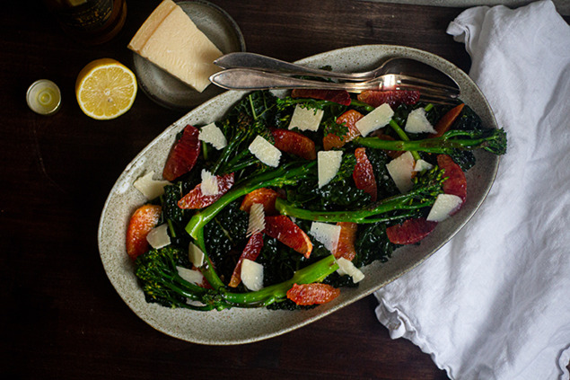 - Fördela blodapelsinfiléerna och sparrisbroccolin över kålen innan du toppar med parmesanflakes.
