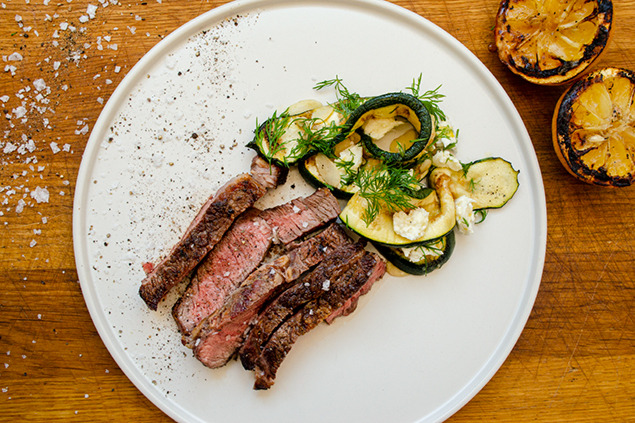 Grilla zucchinin ett par minuter under tiden som köttet vilar, lägg sedan tillbaka i citronoljan och blanda ihop. Toppa med dill, smulad mozzarella, mandel, salt och peppar.