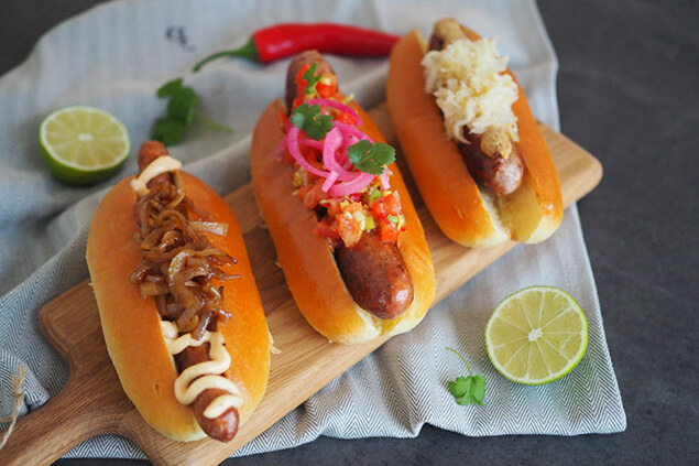Tre korvar med smarriga toppings