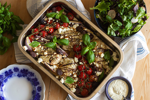 - Placera kycklingfiléerna i ugnsfast form tillsammans med körsbärstomater, oliver och klyftor av rödlök. Pensla kycklingen med olivolja och krydda med timjan, rosmarin, salt och peppar.