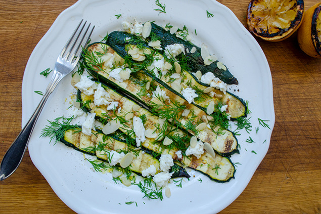 Grilla zucchinin ett par minuter under tiden som köttet vilar, lägg sedan tillbaka i citronoljan och blanda ihop. Toppa med dill, smulad mozzarella, mandel, salt och peppar.