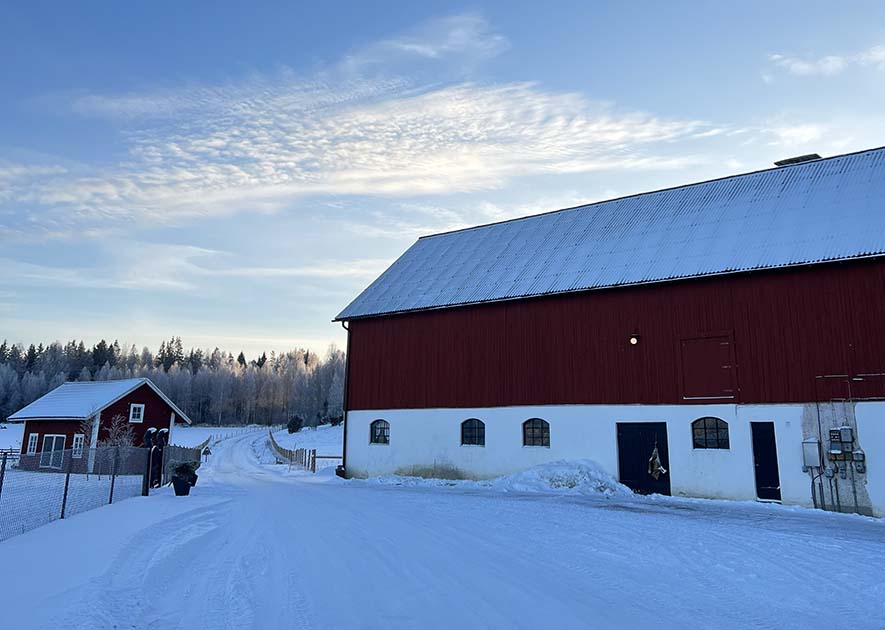 Lisstorp gård i vinterskrud. Här är lammen uppvuxna.