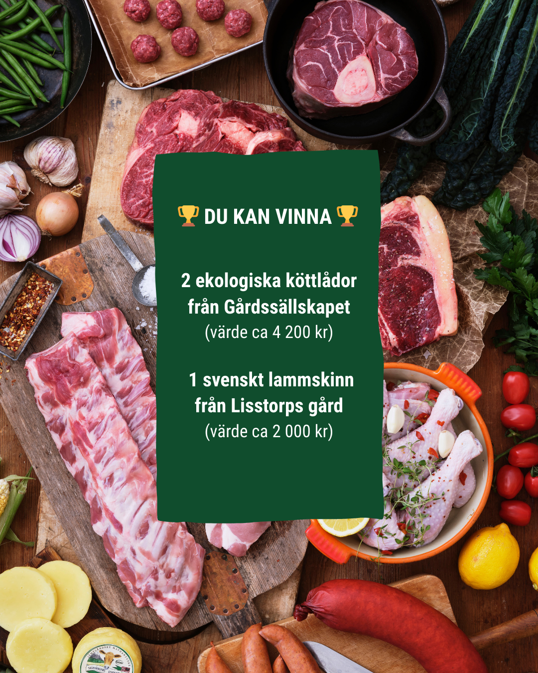 Vinster: 1:a pris: Två stora ekologiska köttlådor från Gårdssällskapet till ett värde av ca 4000 kr + 1 lammskinn från en av våra lammgårdar, värde ca 2 000 kr.